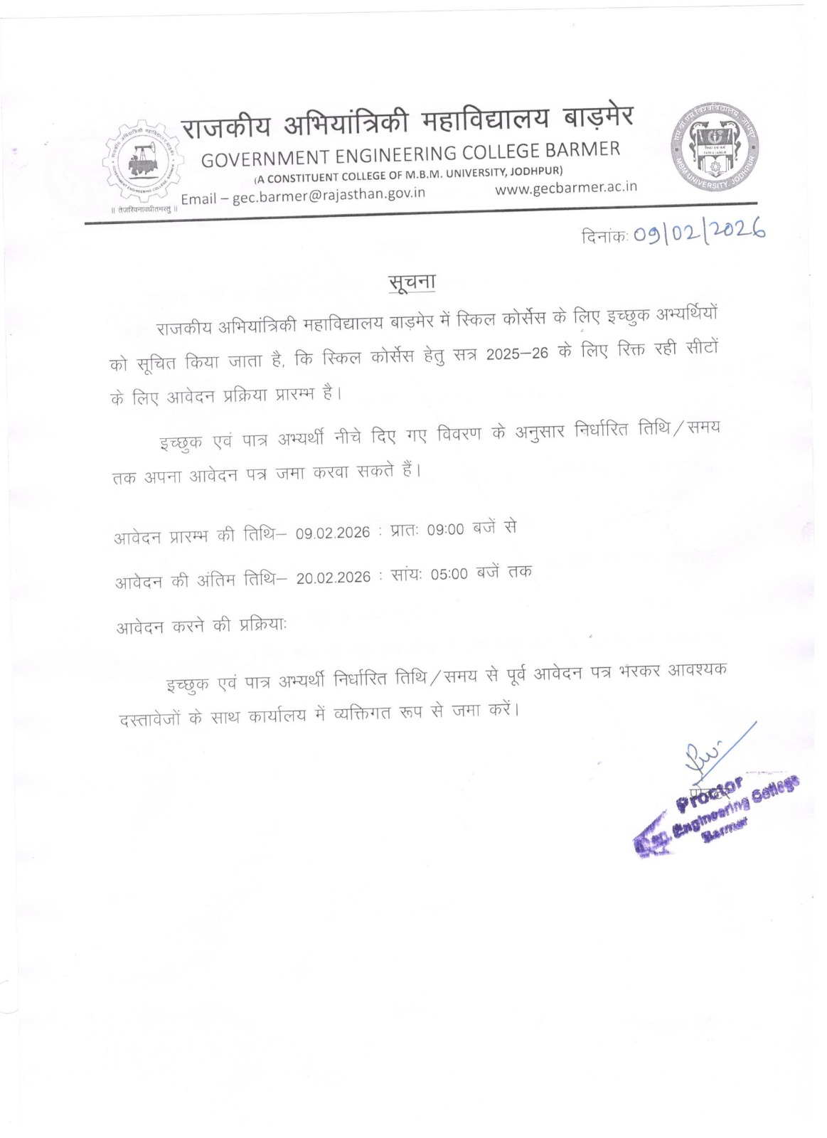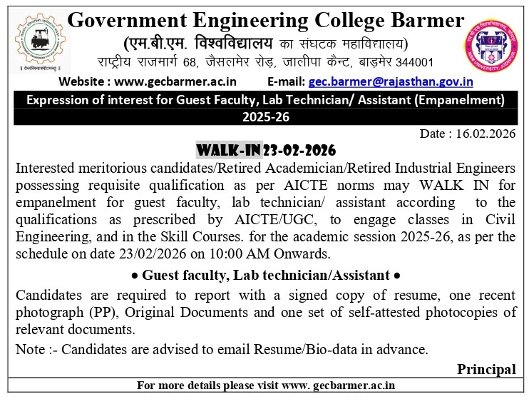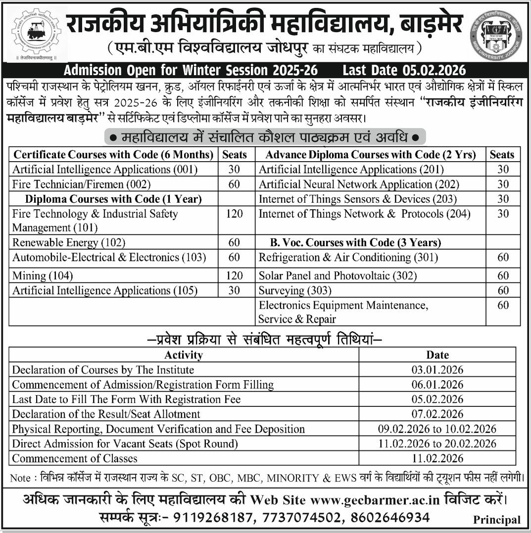 GEC Barmer offers 7 undergraduate branches. The intake is generally 30 to 60 seats per branch: